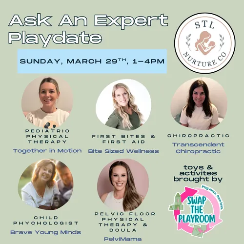 Join us at Nurture STL for a special "Ask an Expert" playdate! While the kids play with our curated toy collection, parents can chat with local professionals including Pediatric Physical Therapists from Together in Motion, First Aid experts from Rated Wellness, and specialists in Chiropractic care, Child Psychology, and Pelvic Floor health. It’s the perfect way to get your questions answered in a low-stress, fun environment.